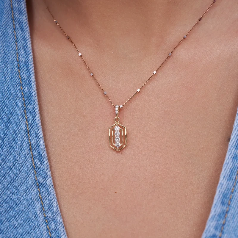 This geometric diamond frame pendant is designed for modern women who love clean lines with a hint of sparkle. Crafted with round lab-grown diamonds arranged in a vertical line within a sleek open-frame silhouette, it is set in solid 9K/14K/18K yellow, white or rose gold. The structured yet minimal design feels contemporary and elegant, sitting comfortably on the neckline for effortless everyday wear. Lightweight and refined, it transitions seamlessly from office hours to casual outings, date nights, and understated evening looks. Made with conflict-free, planet-conscious lab-grown diamonds, this pendant is a thoughtful choice for women who value conscious luxury without compromising on style.